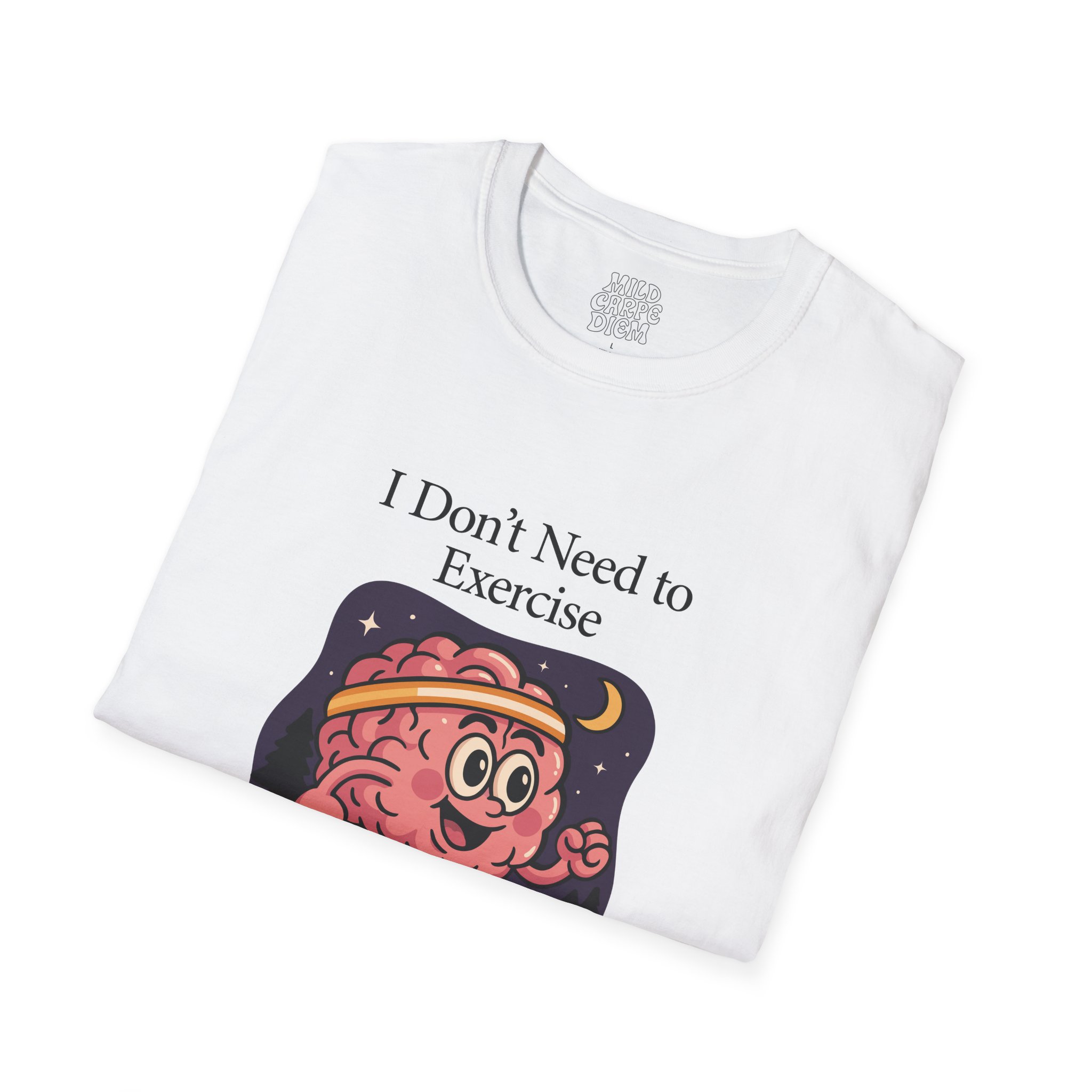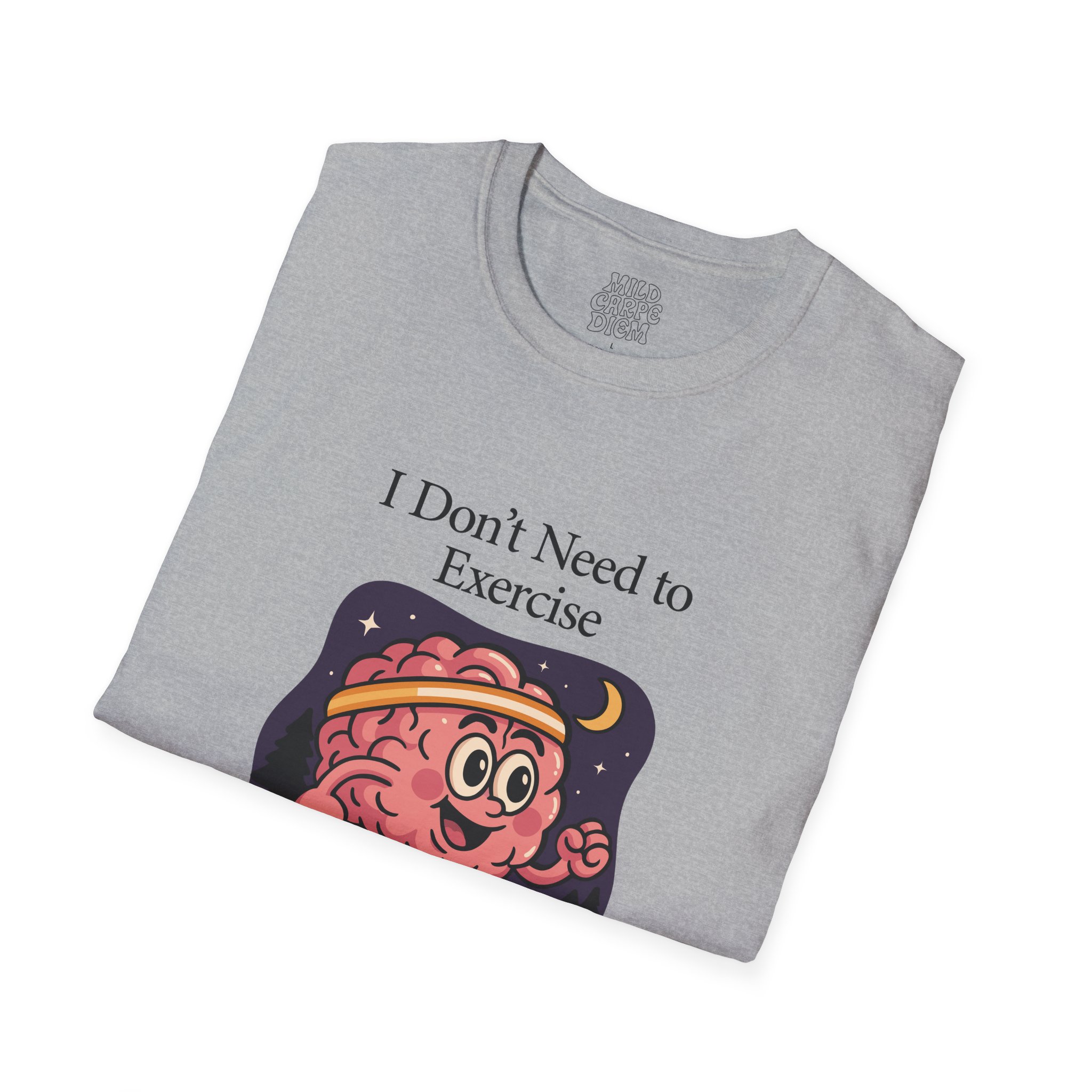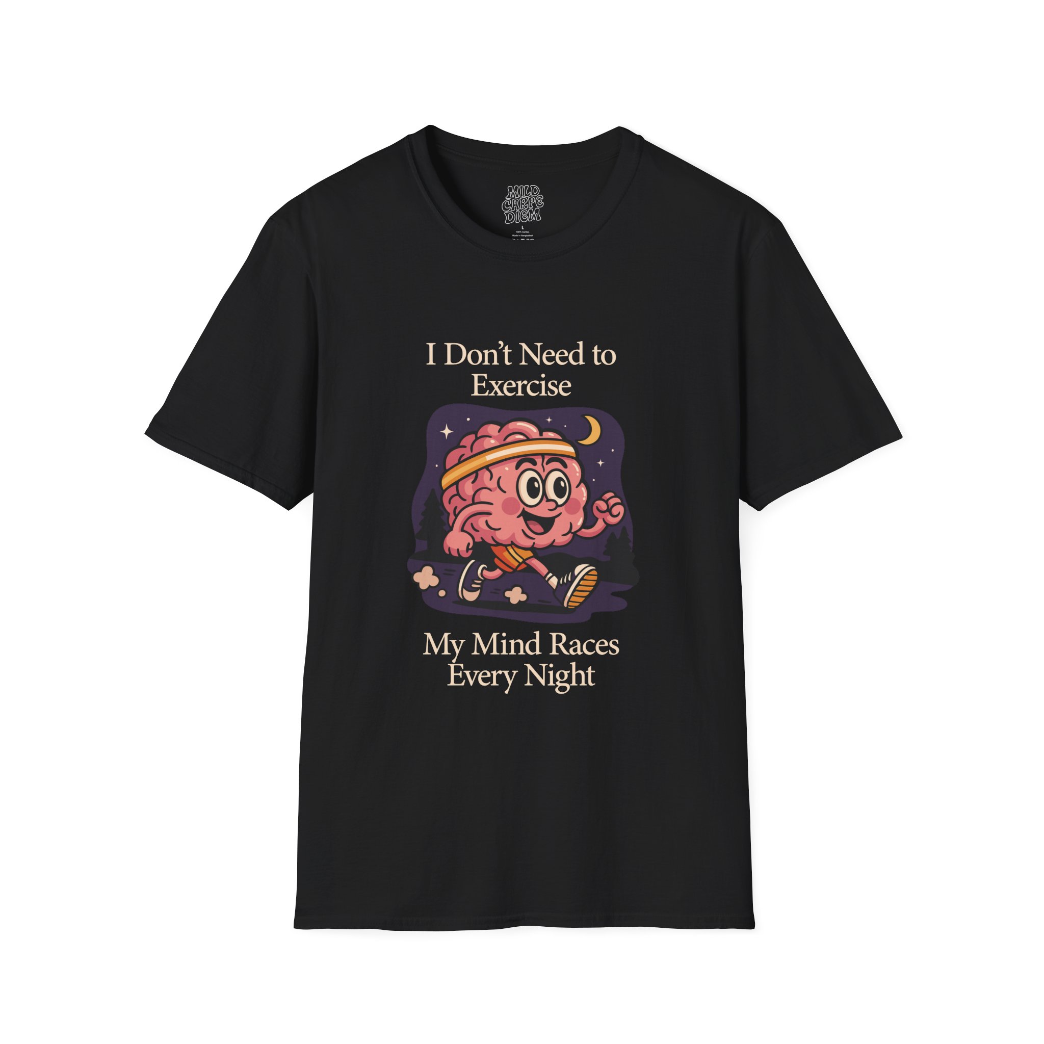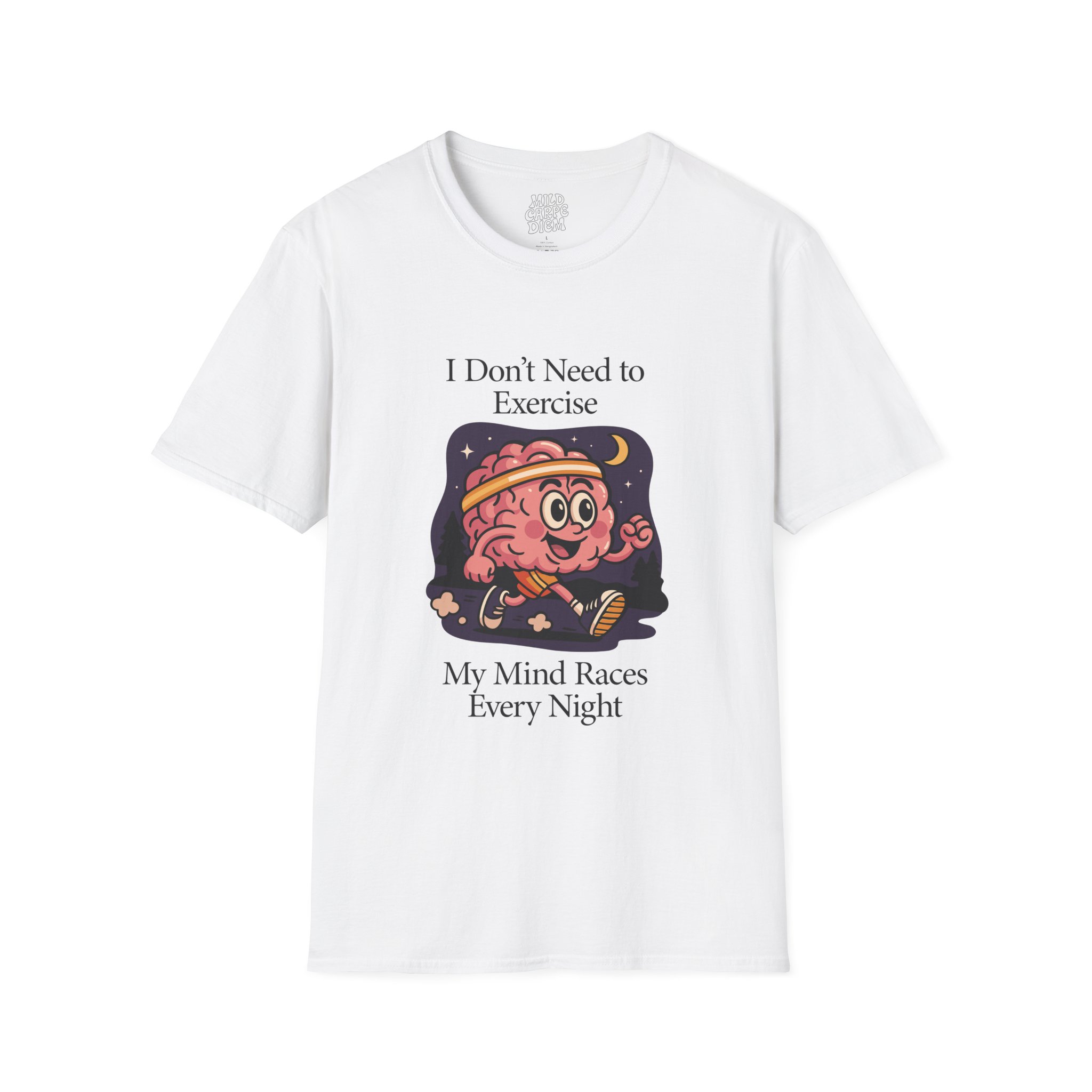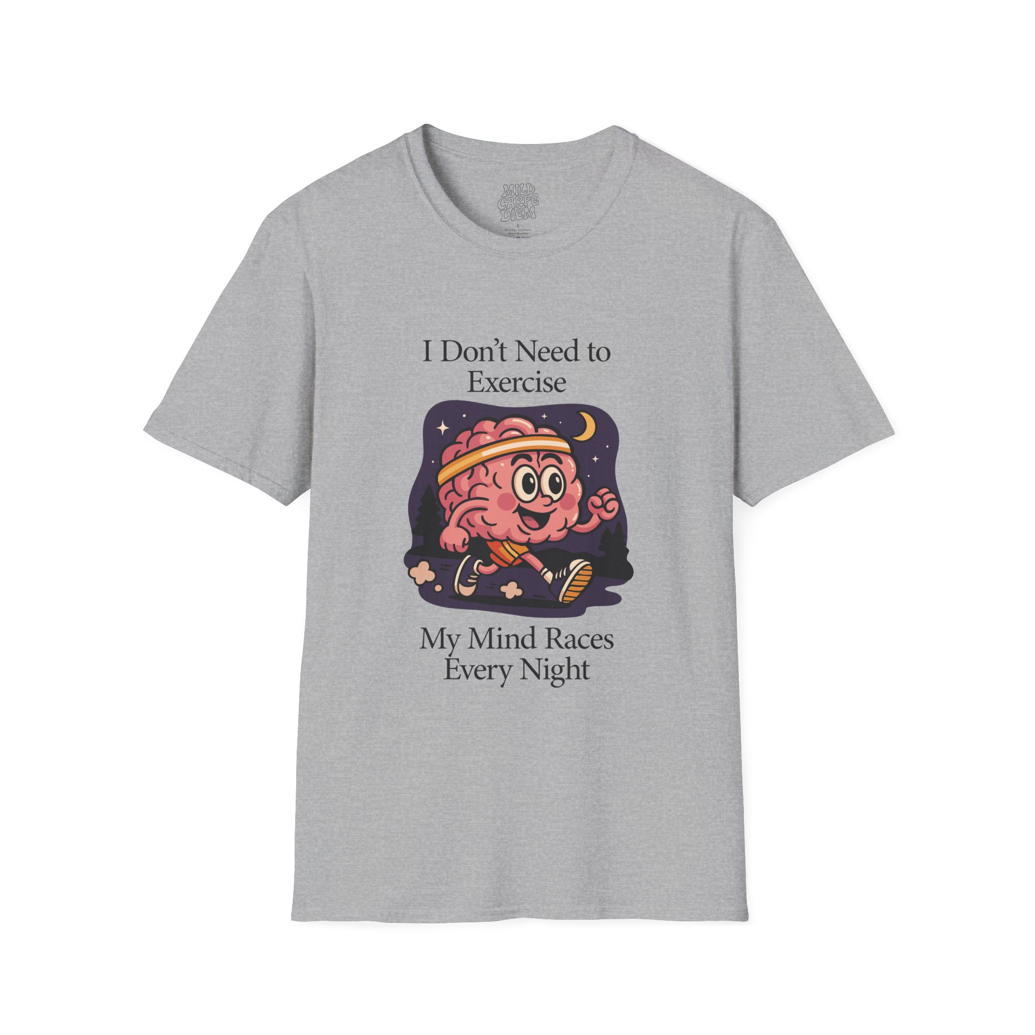 Soft, breathable, and made to be worn every night your thoughts won’t quiet down. This lightweight crew tee carries a playful vintage-style brain character under a moonlit sky with the words “I Don’t Need to Exercise — My Mind Races Every Night.” It lands comfortably between cozy and quirky: easy to layer at home, simple enough for errands, and expressive enough to start a conversation about late-night thinking, anxiety, or creative bursts. The smooth ring-spun cotton feels gentle against the skin while the clean neckline and classic fit keep the silhouette familiar and wearable. Wear it when you’re winding down with tea, pulling an all-nighter, or sharing a laugh with friends who know the feeling.