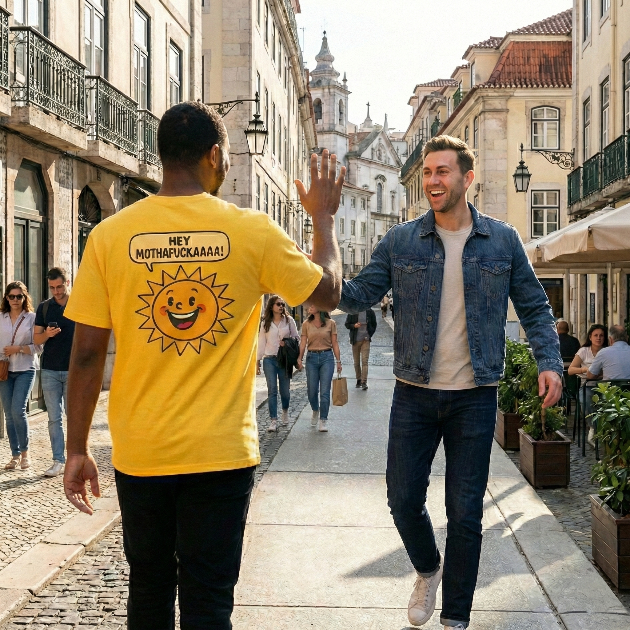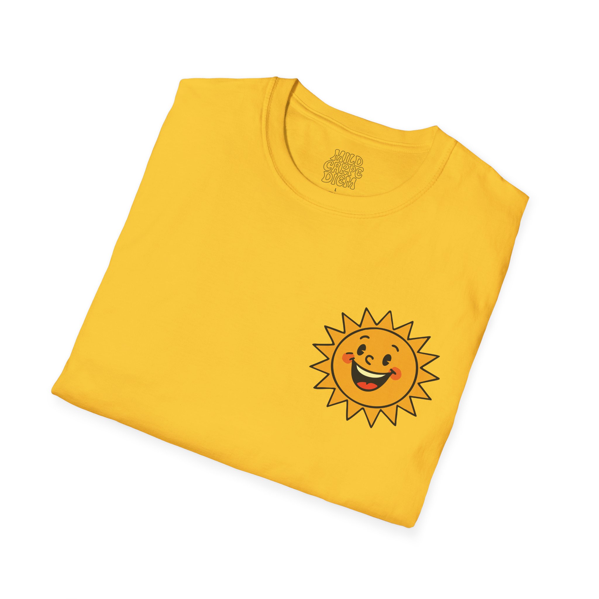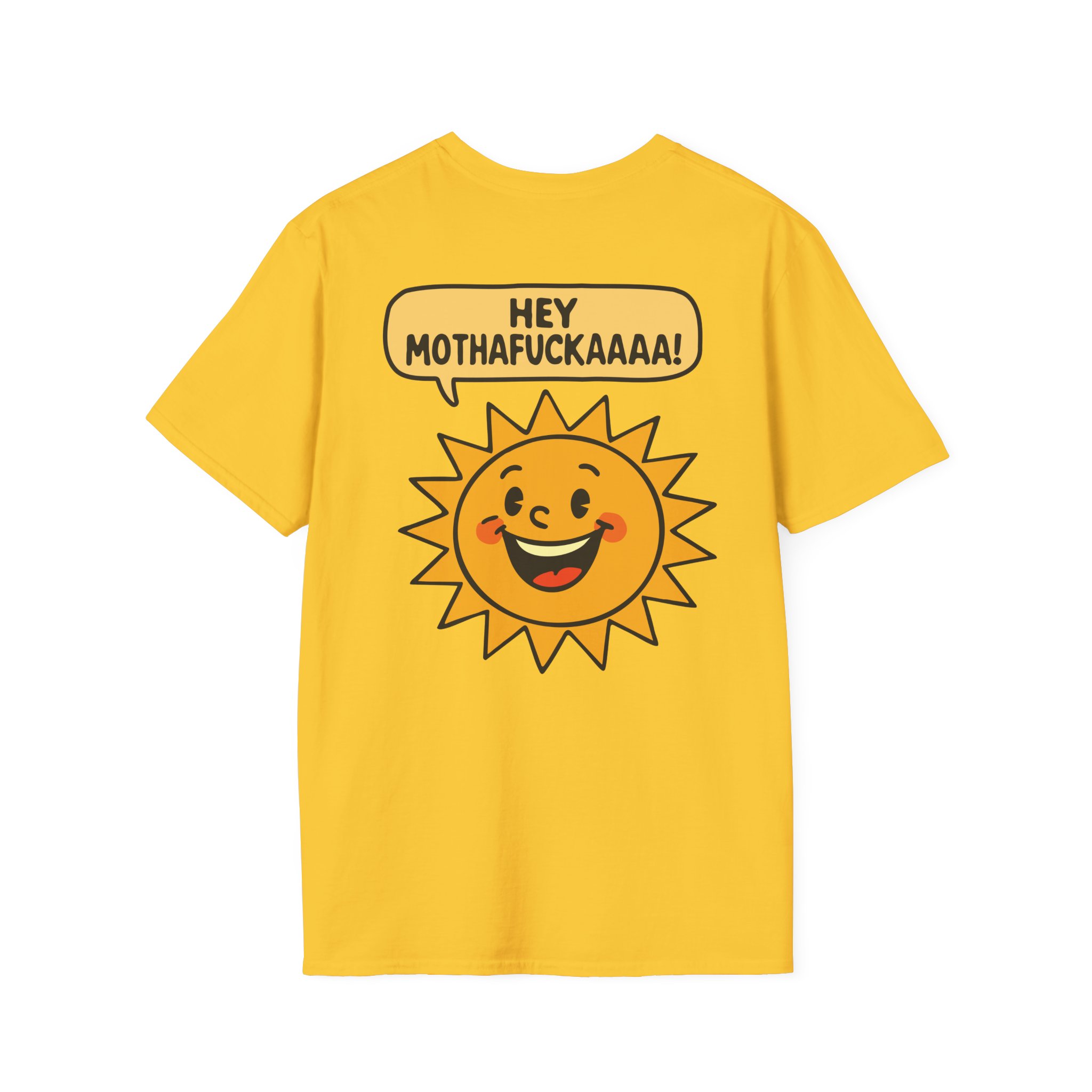 Sunshine with an attitude. This lightweight cotton tee carries a cheeky retro sun illustration—small on the chest, bold across the back—so your mood arrives before you do. The fabric feels soft and breathable, the classic crew and relaxed cut move with you, and reinforced details like ribbed collar and shoulder tape keep it looking fresh after repeat wears. Wear it to brighten a laid-back day, poke fun at the commute, or bring a sunbeam of sarcasm to a backyard hangout.